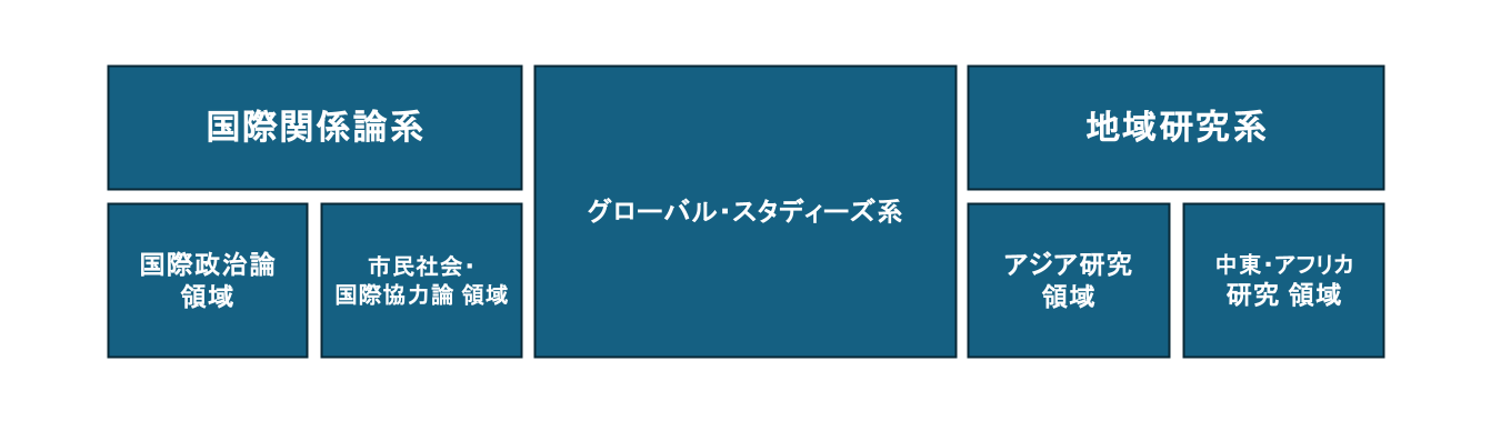 FGSでは、国際関係論の下に「国際政治論」と「市民社会・国際協力論」、地域研究の下に「アジア研究」と「中東・アフリカ研究」という、二つの学問分野(系)と四つの領域、さらにそれらの視点を併せ持つグローバル・スタディーズ系の科目群を学科科目として用意しています。